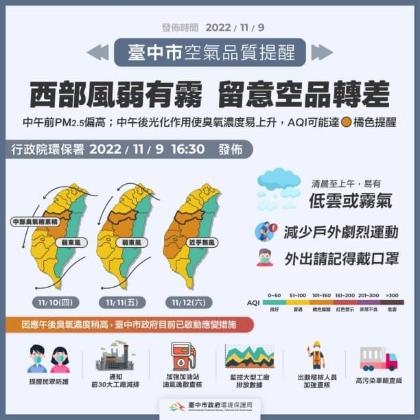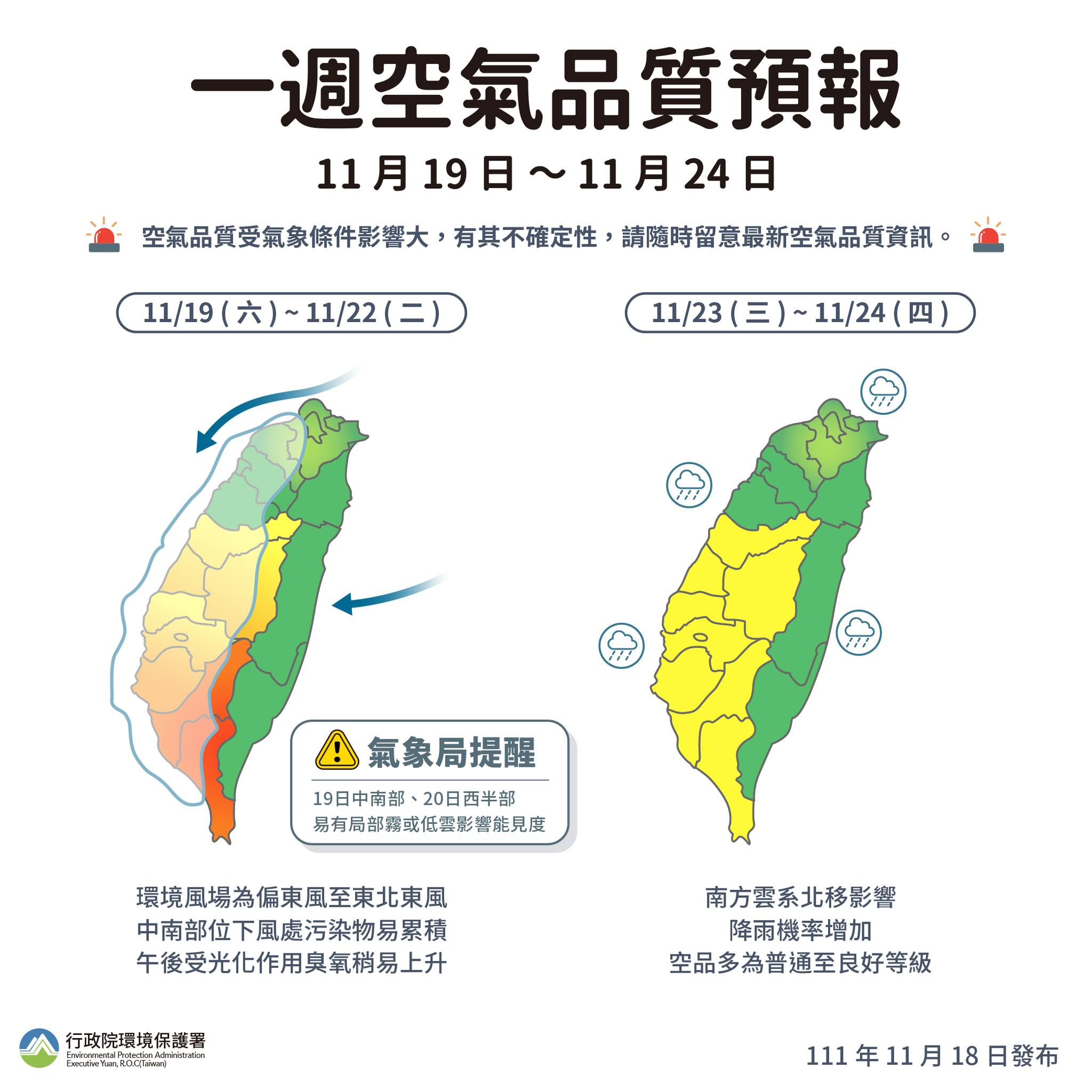 11/19 至 11/22:環境風場為偏東風至東北東風,迎風面地區擴散條件佳,中南部地區位下風處,污染物易累積,午後受光化作用影響,臭氧稍易上升11/23 至 11/24:受南方雲系北移影響,降雨機率增加,空氣品質多為普通等級...